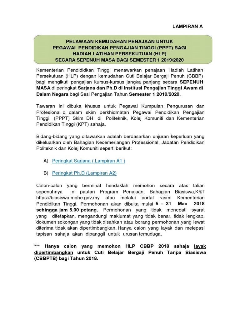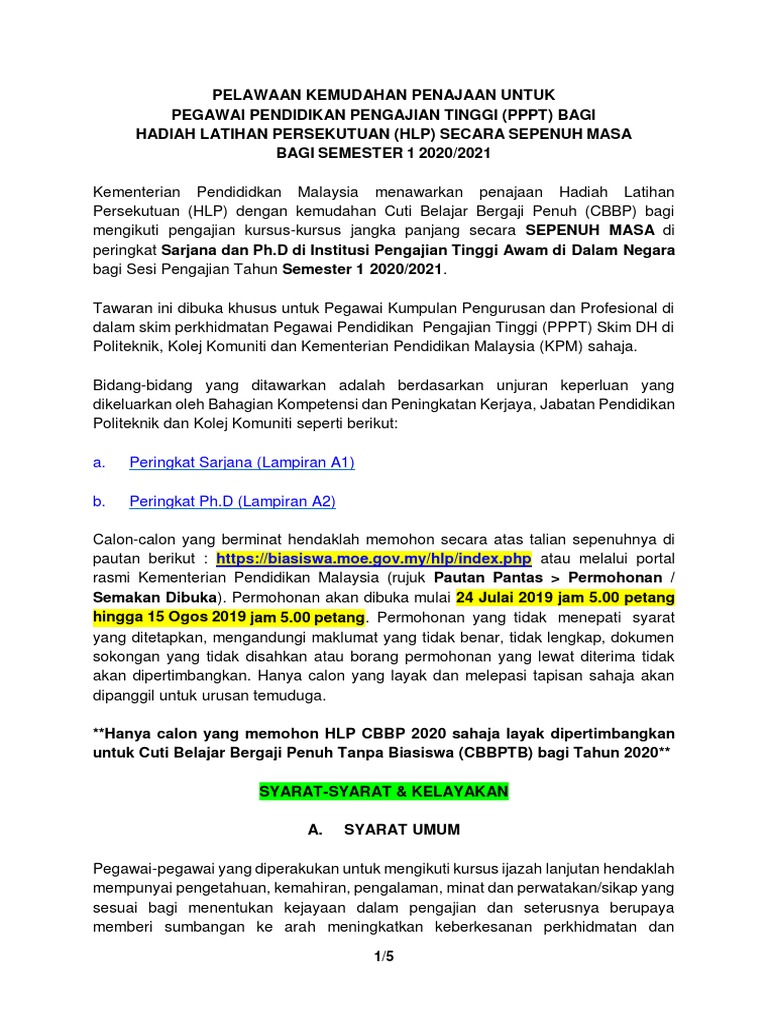 Https Www Moe Gov My Pekeliling 630 Garis Panduan Cuti Belajar Bergaji Penuh Pegawai Perkhidmatan Pendidikan File from Cuti belajar bergaji penuh (cbbp) bermakna cuti yang diluluskan oleh pihak berkuasa melulus kepada seseorang pegawai untuk mengikuti kursus atau prinsip asas pemberian kemudahan cbbp kepada kumpulan sokongan bagi mengikuti latihan kemahiran (teknikal dan vokasional) di bawah. ● untuk tatacara permohonan yang lengkap anda boleh baca disini. Cuti yang diluluskan oleh pihak berkuasa melulus kepada seseorang pegawai untuk mengikuti kursus atau pengajian di mana dalam tempoh tersebut pegawai dibayar gaji. · bagi calon yang telah mengikuti cuti belajar melebihi 12 bulan di dalam atau di luar negara, boleh dipertimbangkan untuk mengikuti kursus jangka panjang yang berikutnya sama ada di dalam atau di luar negara selepas genap 2 tahun tamat mengikuti kursus yang terdahulu dengan jayanya Penuh pegawai perkhidmatan pendidikan bagi tahun 2018, kpm membuka permohonan penajaan/cuti belajar kepada. Disedia untuk pegawai sokongan melanjutkan pengajian di peringkat diploma dan ijazah pertama melalui 2 kaedah 1. Cuti belajar bergaji penuh (cbbp). Cuti belajar separuh gaji (cbsg).
