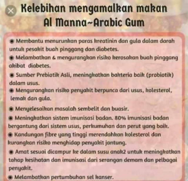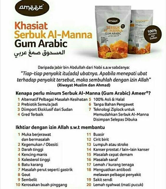 Khasiat, sejarah dan merawat buah pinggang by dr latif saad beberapa tahun ini, 'arabic gum' atau gam arab telah menjadi salah satu makanan yang terkenal dan dikatakan mempunyai banyak khasiat dan kebaikan. Kandungan prebiotik dalam gam arab menjangkau sehingga 85%. Manakala, di sudan terutamanya di kordofan dan darfur, gam ini digunakan berabad lamanya tanpa sebarang sekatan. 100% asli tanpa bahan pengawet. Senarai produk yang ada ramuan gam arab. Kelebihan dan khasiat arabic gum. A) cara makan gum arabic untuk kurus. Manna yang disebutkan dalam al quran sebagai makanan di padang pasir untuk kaum nabi musa alaihisalam. Khasiat gam arab (al manna) yang wajib diketahui khasiat gum arabic al manna kami telah menaungi kamu dengan awan (dari panas matahari di padang pasir) dan kami turunkan kepada kamu manna dan salwa, (serta kami berfirman): Campurkan 18 gram serbuk gum arabic ke dalam segelas air 250 ml. Untuk pengetahuan, arabic gum merupakan gam arab yang berasal daripada. ↪ melambatkan & mengurangkan risiko kerosakan buah pinggang. Ianya adalah 8 kali ganda lebih tinggi dari susu ibu.